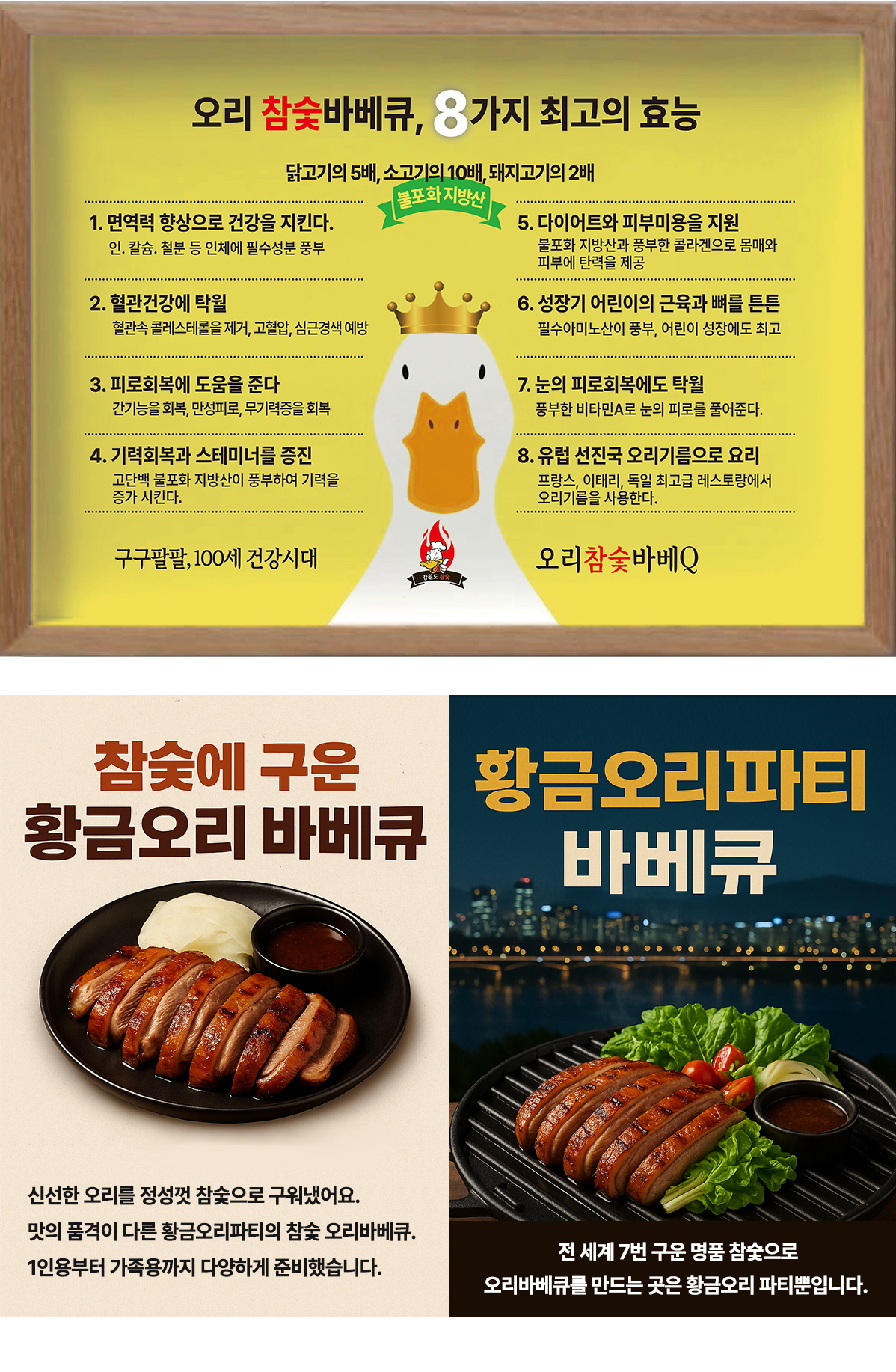 친구, 연인, 가족과 함께 언제 어디서나참숯으로 구운 건강에 좋은 오리 바베큐즐길 수 있습니다.